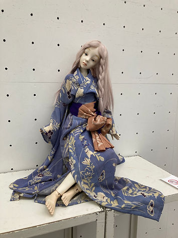 【叢雲(むらくも)】 江戸縮緬の着物を纏う武士の少年です。 雲模様の神秘的な美しさから「叢雲」と名付けました。武士の少年らしい凛とした佇まいの中に、日本らしい静けさと品格が宿るよう意識して制作しました。 きっかけは球体関節人形を学ぶうちに、日本の伝統的な技法、衣装、髪型を取り入れた作品をいつか作りたいと思い始めたことです。 「叢雲」は、人形本体は細かい造作がしやすい石塑粘土を使っていますが、表面は伝統的な胡粉を塗って仕上げました。 また、ボディは『三つ折れ人形』の技法を用いて、脚の付け根・膝・足首の三か所を折り曲げて正座ができるようになっています。 日本の生活様式から生まれた三つ折れ人形は本来は子供が着せ替えたり、抱いたりして遊びました。 この「叢雲」も鑑賞用だけでなく、動かしたり正座をさせることにより、伝統と温もりを同時に感じていただけたら幸いです。 ――かつて多くの人に親しまれたそんな日本の人形の魅力を現代の創作として、少しでも今に伝えられたらと思います。