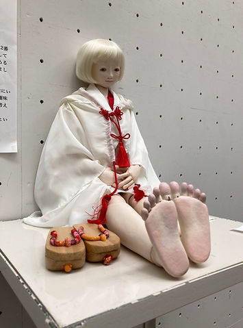 たましいが桃色になって熟するとき ・コンセプト 私はイノセントなものに存在する聖性、不可侵さ。それを失う境界にいる存在に強く惹かれます。 人体では大人でも子供でもないマージナルな存在が好きです。アンビバレントな感情の中にエロティシズムがあると思っています。人間であれば徐々に成長していきますが、羽化を経て急激に大人になる生物もいます。蝉に代表するように、脱皮したてのあの柔らかくて白んだ美味しそうな見た目は、とても無防備で、神秘的で美しいものです。また、これから生物としての役割を果たし、無垢が失われる儚さを秘めています。子供の頃に、兄が捕まえた虫が羽化するのを、じっと見ていた記憶は残酷なまでに美化され、私の心をくすぐり続けるのです。 この作品では、球体関節人形が人間として羽化していく様を表現しました。私たちが作る人形は人の意思をのせ、曖昧な境界をゆらゆらと渡りながら生まれるとても魅惑的な存在です。その概念は、どこにもとどまらない面白さがあり、常に問われ続けてきました。羽化や成長する時のホルモンの働きは生き物にしか成し得ないものです。人形から羽化し、生まれたこの子は、はたして人形なのでしょうか。 あどけなさを残しつつも少女から大人になる瞬間、儚くも美味しそうにもみえるこの肉体は私の習作でもあります。 脱皮は象徴性が高いものですが、それに対して球体関節人形の空洞性と人形の境界という強い意味を結びつけ、私のフェティシズムで再現してみました。 ・制作 脱皮した殻は一度、球体関節人形を造形してから型を取り、脆さを意識して薄くまばらにオーガンジーを固めました。殻っぽさを出すために耳や爪の無い、やや硬めの形状にしています。瞳はまだ太陽に慣れていない淡い色にしつつも、レジンを重ね、中に影が入った時に表情の違いが出るように工夫しました。体の表面はピンクが滲むように半透明な色を重ねてマットな塗装をし、脱皮したての太腿からお腹の部分は、濡れてみずみずしい感じを表現しています。髪の色は肌に馴染むように馬の毛を薄くピンク色に染め、まつ毛や眉毛はエクステを接着しました。肉体は石膏粘土で、可愛らしさを残しつつも大人に向けて成長した体つきを目指し、柔らかそうな、私の理想の肉体を追求しました。 私が作品全体として常に意識していることは詩的な空間を作りたいということです。 幼少期や青年期の記憶や感覚を掘り起こすことが多いですが、詩や、光や生命を描写した写真集からも影響を受けます。光や匂いなどを含めた空間性や五感への刺激を観る人に感じてもらえたら嬉しいです。